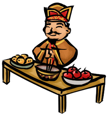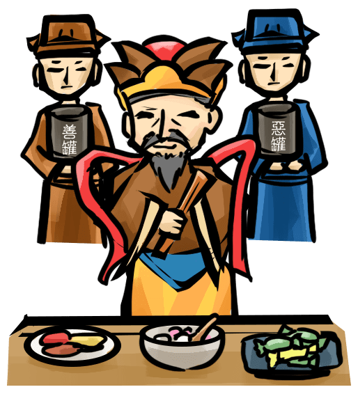由於灶王被派遣到人間考察每家,執行善惡的官職,因此左右隨侍兩神,一捧「善罐」、一捧「惡罐」,隨時將一家人的行為紀錄保存於罐中,年終時總計之後再向玉帝報告,所以每年農曆12/24送灶神的供品一般都用又甜又黏的食品,例如湯圓或麥芽糖,主要讓灶神吃甜甜,讓他回天上時多說好話,得到「玉皇大帝」的賜福,決定這一家人明年整年的財運!