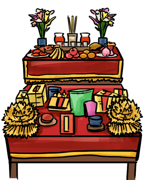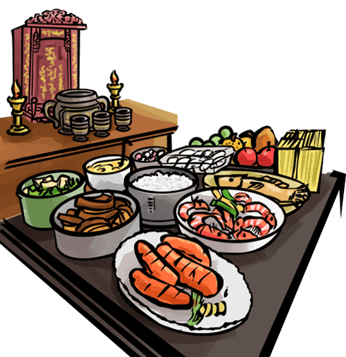茶或酒三杯、三牲、水果3或5種、紅龜粿 、年糕。