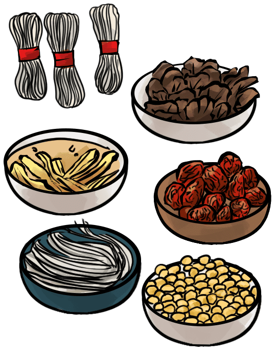 茶或酒三杯、麵線三束(綁紅紙)、水果5 種、齋菜12碗(或24碗、或36碗,一 般都包含金針,代表五行中的金;木耳或香 菇,代表五行中的木;冬粉代表水;紅棗代 表火;土豆代表土)、糖。