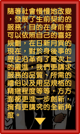 過去,我們在面對死亡時,除了失去至親的不捨與難過,對於操辦喪禮更是一無所知,以往會由醫院配合的禮儀團隊接手協助,應對一連串的選擇題後,配合團隊指引來完成。隨著社會慢慢地改變,發展了生前契約的服務,目的在身前便可以依照自己的喜好規劃,在日新月異的現在,對於身後事的歷史沿革有了層次上的躍進,我們更講求服務的品質、所需的禮俗以及用品規格的精緻程度等等,方方面都更進一步創新,擁有更講究的全新角度。發現之旅不僅是尋找新大陸,更在於運用新視野看大千世界。
