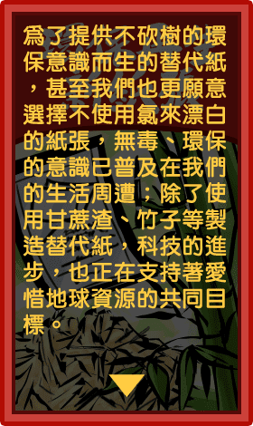 單單是全球的廁紙,每天就能摧毀兩萬七千棵樹!非常駭人!現在我們使用的廁紙、餐 巾紙、衛生紙巾和其他生活用紙,都是為了提供不砍樹的環保意識而生的替代紙,甚至我們也更願意選擇不使用氯來漂白的紙張,無毒、環保的意識已普及在我們的生活周遭;除了使用甘蔗渣、竹子等製造替代紙,科技的進步也正在支持著愛地球的共同目標。