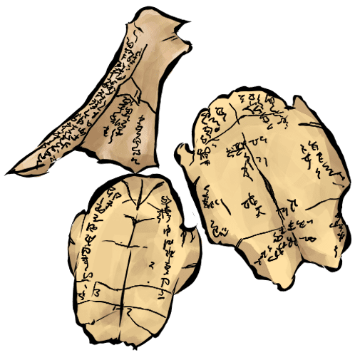 殷商王朝非常的迷信,不論是出征前、打獵之 前都會先占卜,會找一塊龜甲或是獸骨,在上 面鑽一個小孔放在火上面燒,根據斷裂痕跡占 卜吉凶,並把占卜的結果刻在上面,這些龜甲 與獸骨,便是中國人最早的紙。