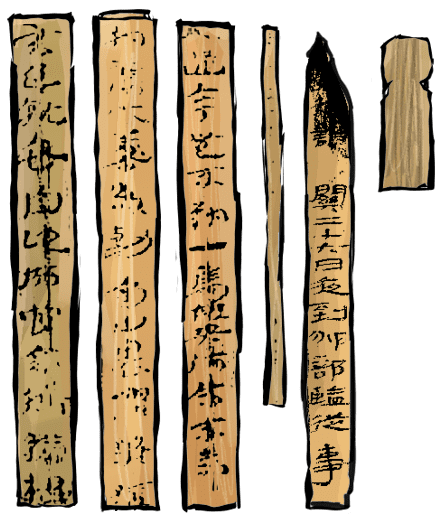 把竹子和樹枝截斷後,灌水漂浸一百多天後,刷洗掉粗殼和青皮(這個步驟叫做殺青) 再把竹子削成細長又平整的長條狀,就可以在 上面寫字。