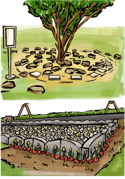 瑞典的情形,位於森林墓地(在樹林之間分置墓石,如同在森林之中長眠一般,並有計畫地綠化)命名為"追想之丘"的散骨區域,在被草地覆蓋的山丘部分撒骨灰,紀念花 園係劃定特定區域,以灑或埋藏骨灰之方式進行,不立墓碑,不記死者姓名,供永續循環使用,顯示人死後一律平等。