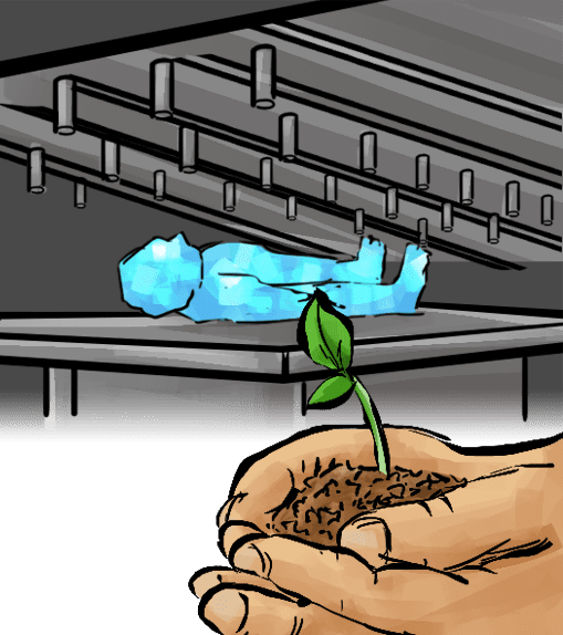 瑞典科學家魏格-馬莎克發現火葬會製造效果不明的毒氣,不比傳統土葬法高明,於是設法改良土葬過程。魏格-馬莎克說,屍體先以液化氮浸溼,最多能產生三十公斤有機 物,這堆有機物放進容易分解的薄棺材,幾個禮拜就完成「回歸大地」的程序。她發現,棺木不要埋的太深,還有肥沃土壤的功效,有如秋天的落葉,肥沃自己的根部。傳統優質棺木的土葬,屍骨要五、六十年才分解完畢。